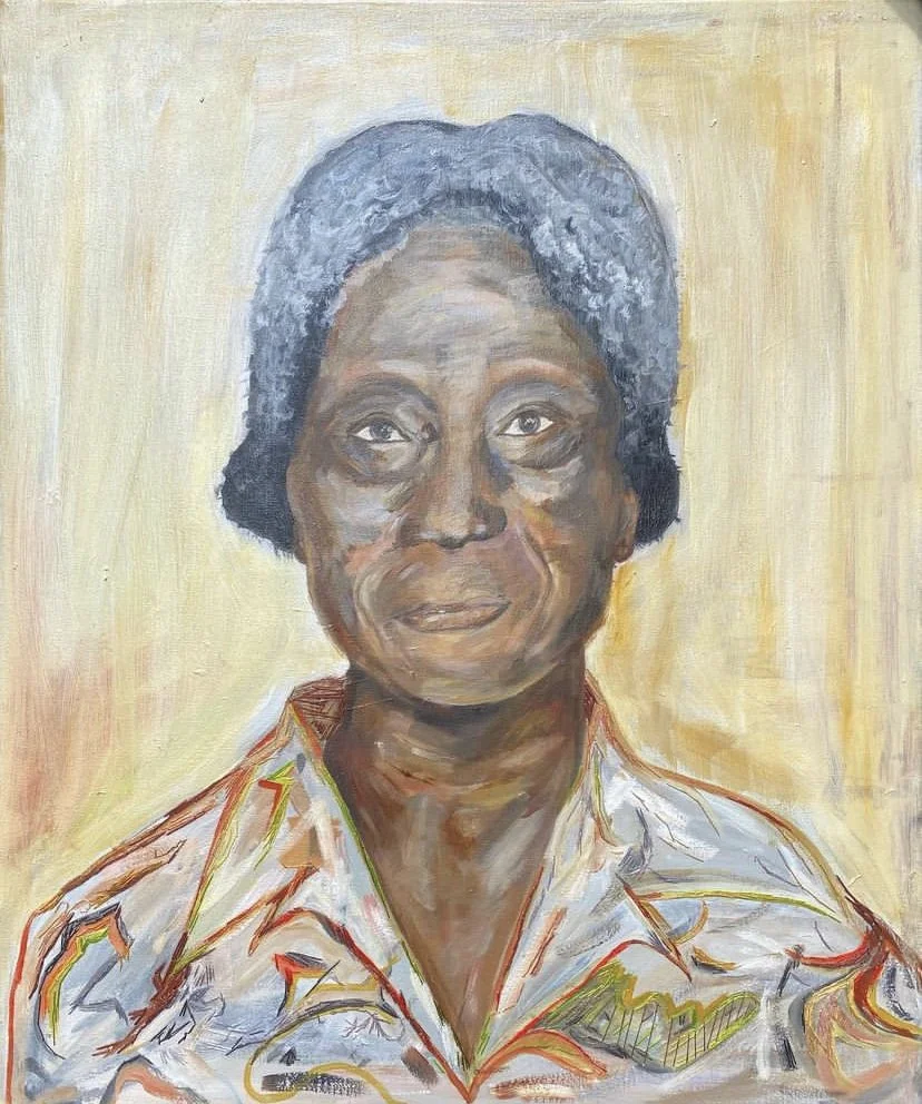 VC, oil and embroidery on canvas, 20in x 24in, 2021
